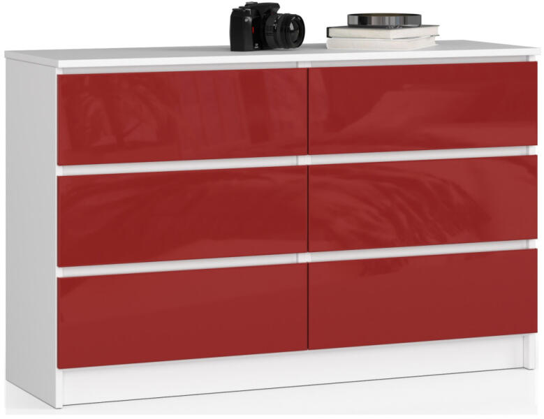 Modern, 6 fiókos komód fehér matt korpusszal és magasfényű piros frontokkal. Kiváló minőségű, kopásálló laminált lapból készült, 120 cm széles tárolómegoldás a stílusos otthonokba. Elegáns tárolás modern kivitelbenEz a modern vonalvezetésű komód tökéletes egyensúlyt teremt a funkcionalitás és az esztétikum között. A fehér matt korpusz és a magasfényű piros