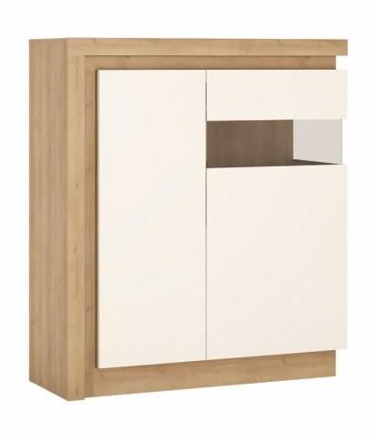 Komód jobbos R - 04, DTD laminált, ellenál a karcolásoknak. Változat: riviéra tölgy/extra magas fényű fehér HG. Mérete (Szé/Ma/Mé): 107x124x42 cm. Az ár tartalmazza a LED világítást. Rendelhető LED Squared világítás az üveges vitrinekbe: egysoros és kétsoros. Ajtó nyitás soft closing rendszerrel.