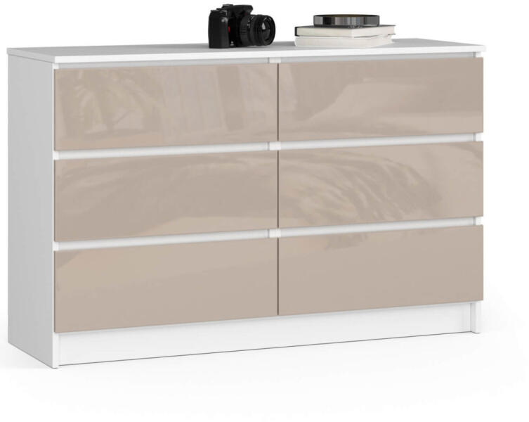 Modern, 120 cm széles komód 6 tágas fiókkal, fehér matt korpusszal és cappuccino magasfényű frontokkal. Tökéletes tárolási megoldás a nappaliba vagy hálószobába, kiváló minőségű akril bevonattal. Elegáns tárolási megoldás modern otthonokbaEz a stílusos komód tökéletesen ötvözi a funkcionalitást és a modern dizájnt. A 120 cm széles bútor 6 tágas fiókkal rendelk
