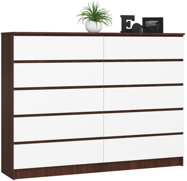 Modern, 10 fiókos komód wenge korpusszal és matt fehér frontokkal. Kiváló minőségű, 16 mm-es kopásálló laminált bútorlapból készült, ABS élzárással a tartósság érdekében. Ideális tárolási megoldás otthoni vagy irodai környezetbe. Elegáns és praktikus tárolási megoldás minden térbeEz a modern vonalvezetésű komód tökéletesen ötvözi a funkcionalitást és az