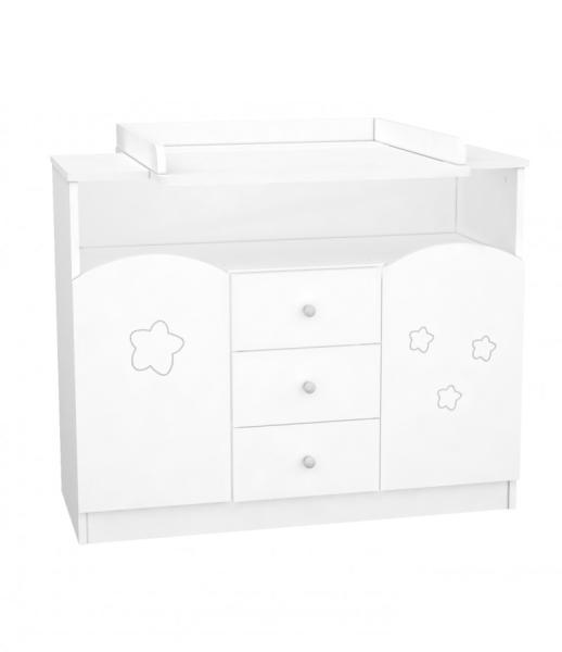 Lekerekített formái és hófehér színe eleganciát, míg mart csillagos mintája vidámságot csempész minden gyermek szobájába. Pelenkázó szekrényünk rendkívül sokoldalúan és praktikusan használható a gyermekszobában, hiszen kevés helyet foglal, szebbé varázsolja a babaszobát, miközben a pici minden holmiját belepakolhatjuk. Lekerekített formái és hófehér színe elega