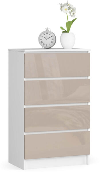 Modern, kompakt komód 4 tágas fiókkal, magasfényű cappuccino frontokkal és fehér korpusszal. Kiváló minőségű MDF és akril anyagokból készült, ideális tárolási megoldást kínál bármely helyiségbe. Elegáns tárolási megoldás modern otthonokbaEz a stílusos komód tökéletesen ötvözi a funkcionalitást és az esztétikumot. A magasfényű cappuccino frontok és a fehér k