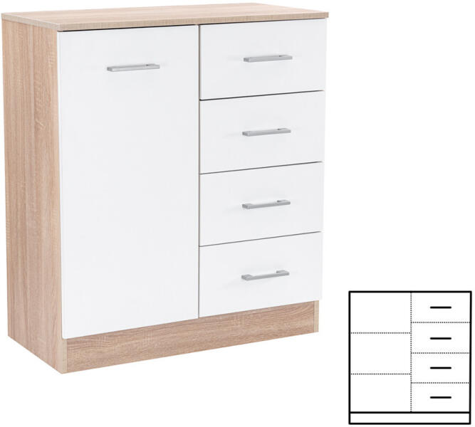Miami komód 1ajtós 4 fiókos 80x92 cm fehér-sonoma tölgy Egy univerzális tároló megoldást keresel, amely elegánsan illeszkedik otthonod bármely szobájába? A Miami komód kiváló választás az előszobába, a nappaliba, a hálószobába, sőt, akár az irodába is. Ez a letisztult dizájnnal rendelkező komód nemcsak funkcionális, hanem stílusos kiegészítője is lehet bármely he