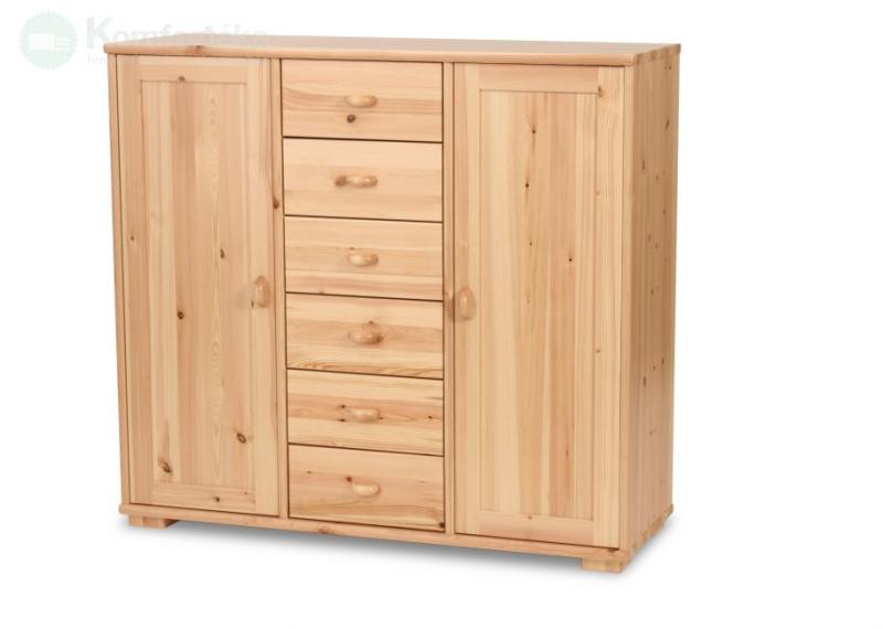 Tömör borovi fenyő. A termék UV-ra keményedő színtelen lakkal van kezelve de kérheti nyers (kezeletlen) és Pácolt (színes) kivitelben is. Pontos pácolási felárakról érdeklődjön telefonon kollégáinknál. A fiókok görgős fióksínnel készülnek. A Vanessa 6 fiókos 2 ajtós komód egyszerű, letisztult vonalaival és betétes ajtóival tökéletes választás a minimalista st
