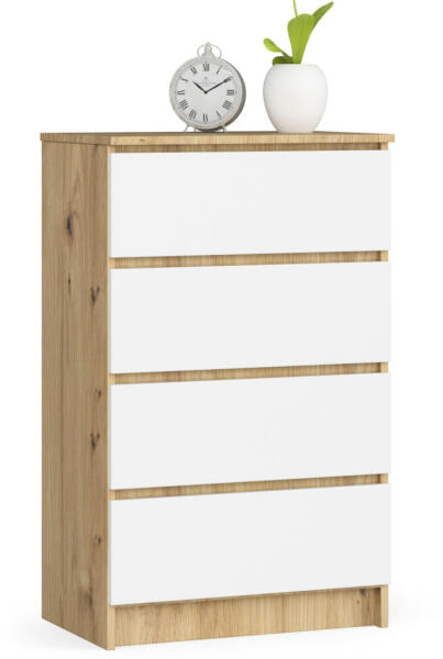 Modern és praktikus komód 4 fiókkal, amely tökéletesen ötvözi az artisan tölgy és fehér színvilágot. A 60 cm széles bútor kiváló tárolási megoldást kínál, miközben stílusos megjelenésével feldobja otthona hangulatát. Elegáns tárolási megoldás modern otthonokbaEz a négyfiókos komód tökéletes választás azoknak, akik praktikus tárolási megoldást keresnek stílu