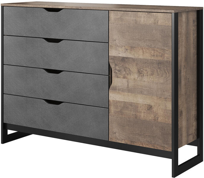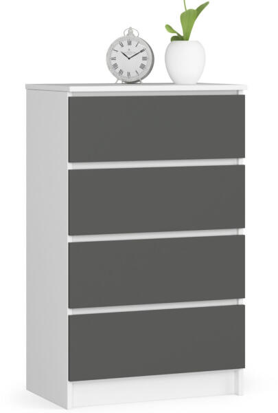 Modern, kompakt komód 4 tágas fiókkal, amely tökéletes tárolási megoldást kínál nappalijába. A fehér korpusz és grafitszürke frontok elegáns kontrasztot alkotnak, míg a kiváló minőségű laminált lap és ABS élzárás tartósságot biztosít. Elegáns tárolási megoldás modern otthonokbaEz a stílusos komód tökéletesen ötvözi a funkcionalitást és a modern dizájnt. A