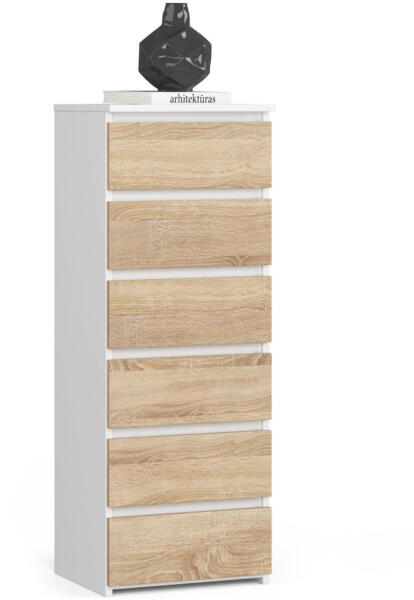 Modern, keskeny komód 6 tágas fiókkal, amely tökéletes megoldást nyújt a kisebb terekbe. A fehér korpusz és sonoma tölgy frontok elegáns kombinációja harmonikusan illeszkedik bármilyen lakberendezési stílushoz. Elegáns tárolási megoldás kompakt méretbenA CL6 keskeny komód egy praktikus és stílusos bútordarab, amely tökéletesen ötvözi a funkcionalitást és az esztétik