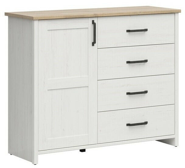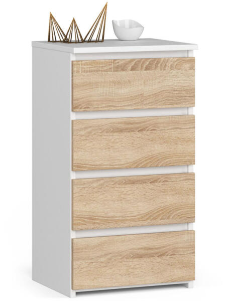 Modern, kompakt komód 4 tágas fiókkal, amely tökéletes tárolási megoldást kínál kis terekbe. A fehér korpusz és sonoma tölgy frontok elegáns kombinációja harmonikusan illeszkedik bármely lakberendezési stílushoz. Elegáns tárolási megoldás kompakt méretbenAz AKORD CL4 komód a modern design és praktikus funkcionalitás tökéletes ötvözete. A 40 cm széles bútor négy t