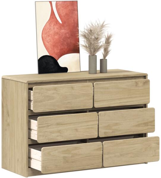 Ez a fából készült fiókos szekrény, amely elegáns bájt áraszt, lakberendezése központjává fog válni. Tömör fenyőfa: A tömör fenyőfa egy gyönyörű természetes anyag. A fenyőfa egyenes erezetű, a csomók pedig jellegzetes, rusztikus megjelenést biztosítanak az anyagnak. A tömör fenyőfából készült fiókos szekrény masszív és stabil. Bőséges tárolóhely: A táro