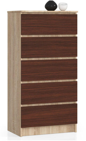 Modern, praktikus 5-fiókos komód Sonoma tölgy korpusszal és wenge frontokkal. Kiváló minőségű, 16 mm-es laminált bútorlapból készült, ABS élzárással a tartósság érdekében. Elegáns tárolási megoldás modern otthonokbaEz a stílusos komód tökéletes egyensúlyt teremt a funkcionalitás és az esztétika között. A Sonoma tölgy korpusz és wenge fiókok harmonikus színkom