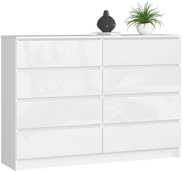 Modern, nyolcfiókos komód magasfényű fehér akril frontokkal és matt fehér korpusszal. Tágas tárolóhelyet biztosít 138 cm szélességével és 99 cm magasságával, tökéletes választás a nappaliba vagy hálószobába. Elegáns tárolási megoldás modern otthonokbaAz AKORD CLP komód a modern design és funkcionalitás tökéletes ötvözete. A nyolc tágas fiók bőséges tárolóhe