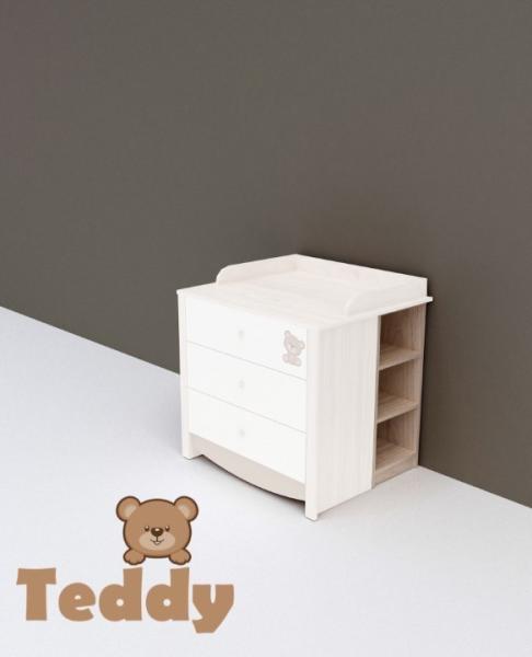 Elegáns, visszafogott, letisztult forma, ugyanakkor kellemes, harmonikus benyomást kelt. A cappuccino és a krémes vanília színek a szilfa természetességével melegséget, otthonosságot, nyugalmat árasztanak. A Teddy nyitott polc a pelenkázó toldalék alá, egy praktikus megoldás a pelenkázásnál. Polcai segítik a pelenkázáshoz szükséges dolgok pl. krémek, popsitörlők tárol