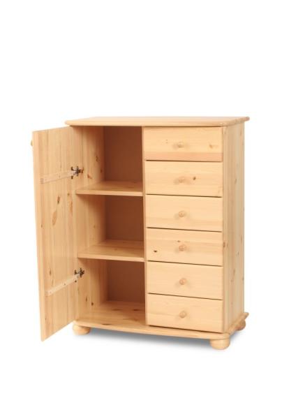 Andi 1 ajtós 4 fiókos 73 cm magas borovi fenyő komód 22 mm anyagvastagságú első osztályú minőségi borovi fenyőből készítjük. Natúr lakkozott és pácolt kivitelben is rendelhető. 80 cm szél. x 73 cm mag. x 45 cm mély. Összeszerelt termék Magyar termék! PÁCOLÁS +20%.