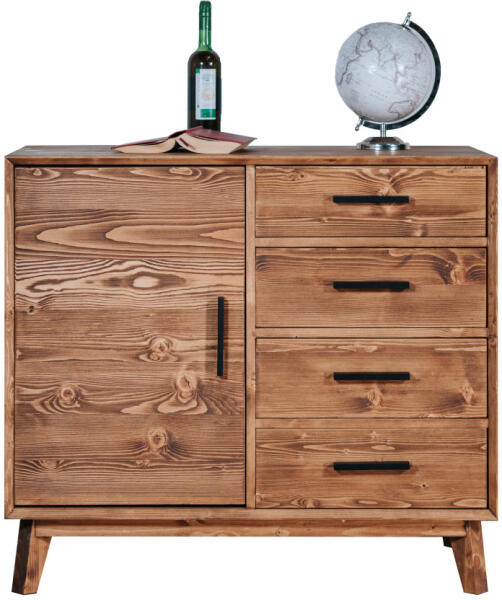 Ez a skandináv bájt sugárzó, fából készült fiókos szekrény otthona központi eleme lesz. Tömör fenyőfa: A tömör fenyőfa egy gyönyörű természetes anyag. A fenyőfa egyenes erezetű, a csomók pedig jellegzetes, rusztikus megjelenést biztosítanak az anyagnak. A tömör fenyőfából készült fiókos szekrény masszív és stabil. Bőséges tárolóhely: A tárolószekrény 4 f