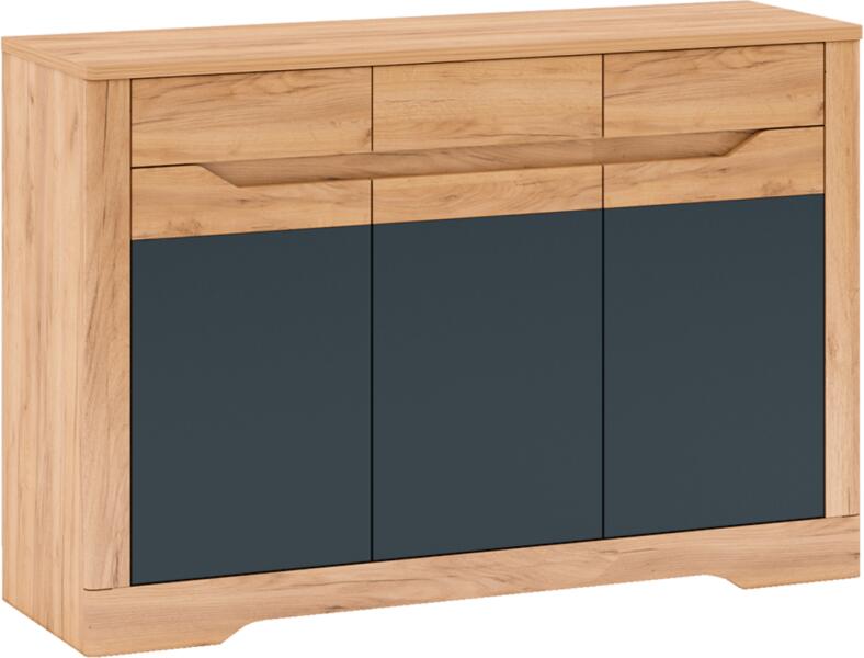 Komód E, tölgy craft arany/grafit szürke, FIDEL Nappali bútor > Komódok Anyag: DTD laminált/MDF Szín: tölgy craft arany/grafit szürke Méretei (SzéxMéxMa): 135x42x91 cm Korpusz anyag vastagsága: 16 mm Felső lap anyag vastagsága: 22 mm Három fiók Két szekrény Bontásban szállítva.