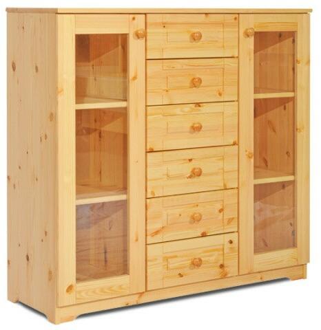 Tömör borovi fenyő. Pácolva is rendelhető. Pácolási felár + 20% Ez a tömör borovi fenyő komód tökéletes választás lehet otthonodba, hogy stílusosan rendezd el apróbb tárgyaidat vagy értékeidet. A hat kényelmes fiók és a két elegáns üveg ajtó lehetővé teszi, hogy könnyen elrendezd és megjelenítsd a kedvenc tárgyaidat. A természetes fenyőfa melegsége és a letisz