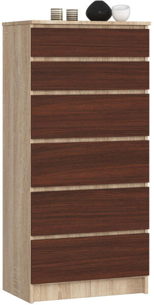 Modern, praktikus 6-fiókos komód Sonoma tölgy korpusszal és wenge frontokkal. Kiváló minőségű, 16 mm-es kopásálló laminált bútorlapból készült, ABS élzárással a tartósság érdekében. Elegáns tárolási megoldás modern otthonokbaEz a 60 cm széles, 6-fiókos komód tökéletes választás azoknak, akik praktikus tárolási megoldást keresnek stílusos kivitelben. A Sonoma