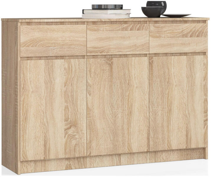 Modern és praktikus komód 3 ajtóval és 3 fiókkal, amely tökéletes tárolási megoldást kínál. A Sonoma tölgy színű, kopásálló laminált lapból készült bútor elegáns megjelenést és maximális funkcionalitást biztosít otthonában. Elegáns tárolási megoldás modern otthonokbaEz a sokoldalú komód tökéletesen ötvözi a funkcionalitást és az esztétikumot. A 138 cm sz
