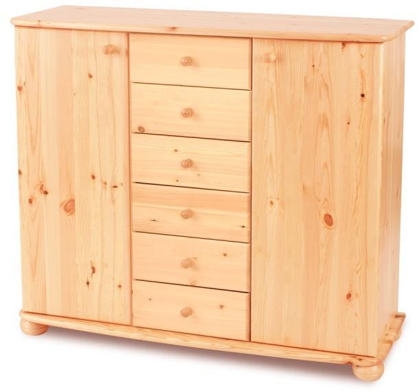 Tömör borovi fenyőből készül. 2 ajtós (mögötte 2 polclappal) 6 fiókos komód. Alkalmas gyerekszobába, nappaliba, hálóba. Oldószer mentes lakkal kezelve. Nem lapra szerelt, egyben szállítandó. A képen pácolt változat látható, az ár a natúr lakkosra vonatkozik. Az Anikó 6 fiókos 2 ajtós komód ívelt kialakításával a klasszikus vonalakat követi. Alapanyaga skandináv b