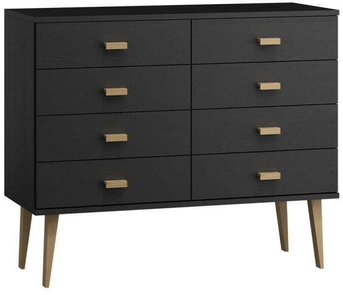A komód teljes egészében tömör fenyőfából készült. A komód fekete környezetbarát lakkal és színtelen lakkal van lakkozva. Lapraszerelve érkezik! Ez a 4-4 fiókos komód teljes egészében tömör fenyőfából készült, amelyet rendkívül gondos és precíz kidolgozás jellemez. A komód fekete ökológiai lakkal és átlátszó lakkal van lakkozva, ami biztosítja a tökéletes