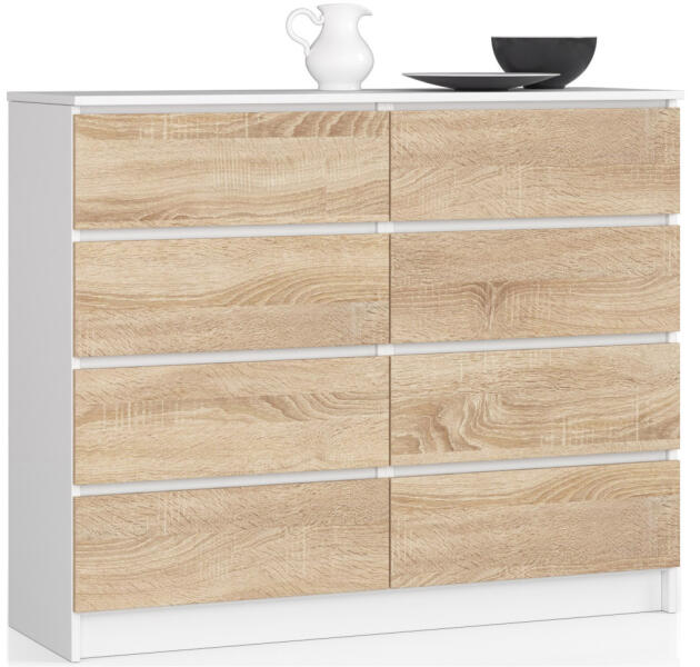 Modern, tágas komód 8 fiókkal, amely tökéletes tárolási megoldást kínál. A fehér korpusz és sonoma tölgy frontok elegáns kombinációja, valamint a 120 cm-es szélesség ideálissá teszi nagyobb terek berendezéséhez. Elegáns tárolási megoldás modern otthonokbaEz a nyolcfiókos komód tökéletesen ötvözi a funkcionalitást és az esztétikumot. A 120 cm széles bútor fehér
