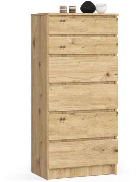 Modern, praktikus 6-fiókos komód Artisan tölgy kivitelben, amely tökéletes tárolási megoldást kínál. A kiváló minőségű laminált lapból készült bútor ABS élzárással és görgős fémcsúszókkal rendelkezik a tartósság és könnyű használat érdekében. Elegáns tárolási megoldás modern otthonokbaAz AKORD CLP sorozat 6-fiókos komódja tökéletes választás azoknak,