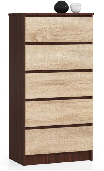 Modern, 5 fiókos komód laminált bútorlapból, wenge színű vázzal és sonoma tölgy frontokkal. Praktikus tárolási megoldás 60 cm szélességgel, kiváló minőségű ABS élzárással és fiókvédelemmel. Elegáns tárolási megoldás modern otthonokbaEz a stílusos komód tökéletes egyensúlyt teremt a funkcionalitás és az esztétika között. A wenge színű váz és sonoma tölgy