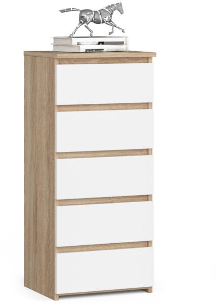 Modern, keskeny komód 5 tágas fiókkal, sonoma tölgy és fehér színkombinációban. Kiváló minőségű laminált bútorlapból készült, ABS élzárással a tartósság érdekében. Elegáns tárolási megoldás kis terekbeA CL5 keskeny komód tökéletes választás, ha korlátozott hellyel rendelkezik, de nem szeretne lemondani a stílusos tárolásról. A sonoma tölgy korpusz és fehé