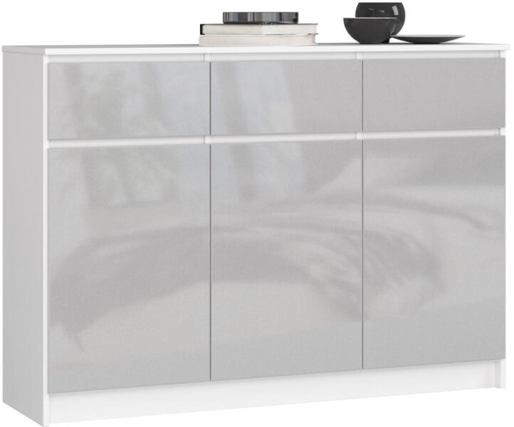 Modern, elegáns komód 3 ajtóval és 3 fiókkal, metál fényes frontokkal és fehér korpusszal. Kiváló minőségű 16mm-es laminált bútorlapból készült, ABS élzárással a tartósság érdekében. Elegáns tárolási megoldás modern otthonokbaEz a stílusos komód tökéletes egyensúlyt teremt a funkcionalitás és az esztétikum között. A fehér korpusz és a metál fényes fronto