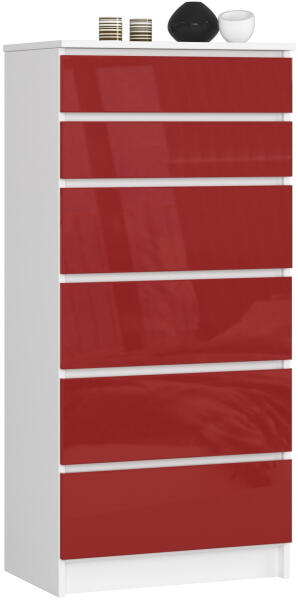 Modern, hat fiókos komód magasfényű piros frontokkal és fehér korpusszal. Kiváló minőségű, kopásálló laminált lapból készült, praktikus tárolási megoldást kínál a mindennapi használathoz. Elegáns tárolási megoldás modern otthonokbaEz a stílusos komód tökéletesen ötvözi a funkcionalitást és a modern dizájnt. A magasfényű piros frontok és a fehér korpusz kont