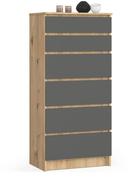 Modern, praktikus 6-fiókos komód Artisan tölgy és matt szürke színkombinációban. Kiváló minőségű laminált bútorlapból készült, ABS élzárással és görgős fémcsúszókkal a maximális tartósságért és kényelemért. Elegáns tárolási megoldás modern otthonokbaEz a stílusos komód tökéletesen ötvözi a funkcionalitást és az esztétikát. Az Artisan tölgy korpusz