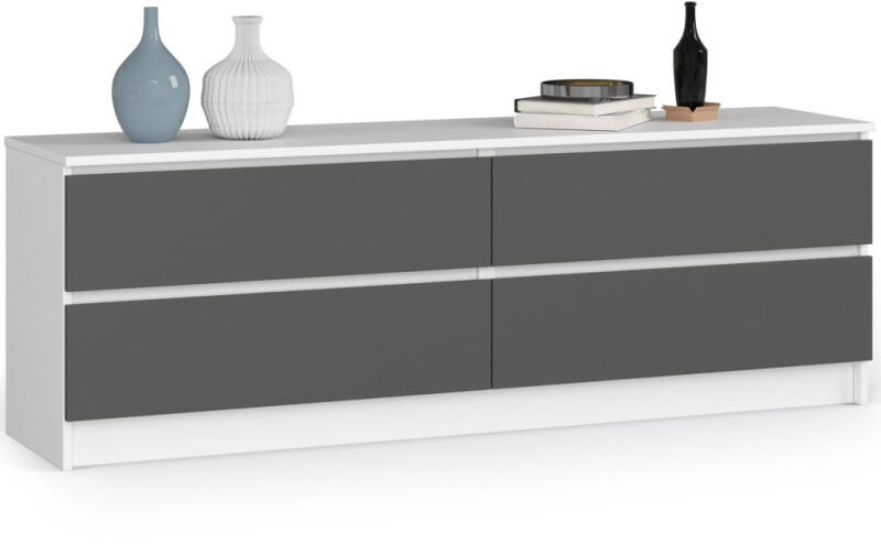 Modern, széles komód 4 tágas fiókkal, amely tökéletes tárolási megoldást kínál. A fehér korpusz és szürke matt frontok elegáns kombinációja minden enteriőrbe harmonikusan illeszkedik. Elegáns tárolási megoldás modern otthonokbaEz a széles, alacsony komód tökéletes választás azoknak, akik nagy tárolókapacitást keresnek letisztult dizájnnal. A 160 cm széles bútor n