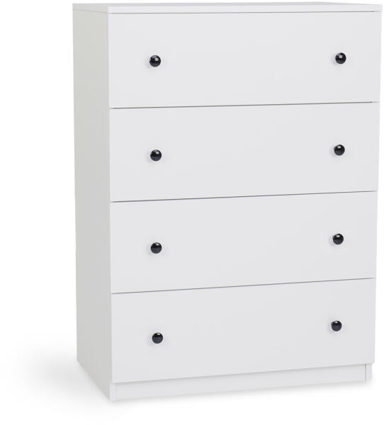 Magasfényű fekete fogantyúkkal díszített minőségi és elegáns fehér LEO L4 komód. Ugyanolyan jól mutat az otthonában, mint az irodában. Ez a komód letisztult, modern designnal rendelkezik, így mindenki számára ajánljuk, aki praktikus és stílusos tároló helyet keres. A semleges fehér színének hála jól mutat a hálószobában, nappaliban vagy a gyerekszobában is. Ez az el