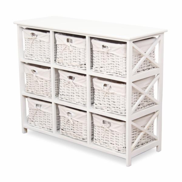 RAFAELLO 9 KOMÓD, FEHÉR - Tömörfa vázzal készült romantikus stílusú komód, amely nem csupán praktikus, hanem dekoratív darabja is az előszobáknak, hálószobáknak, fürdőszobáknak, vagy más tereknek. A textillel bélelt fonott kosarak sok kisebb-nagyobb ruhadarab vagy használati tárgy tárolására alkalmasak. A termékcsaládhoz külön cikkszámon más modellek is rendelhető