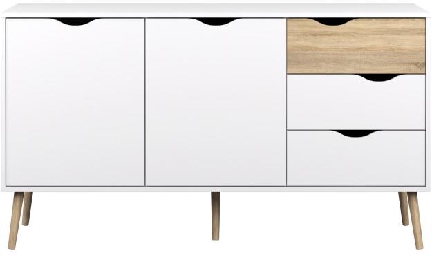 OSLO 75381, komód: 3-fiókos, 2-ajtós, Anyag: DTD laminált, Szín: sonoma tölgyfa/fehér, Méretek, komód (Szé x Ma x Mé): 147x81x39,1 cm -Méretek, fiók (Szé x Ma): 47,3x19 cm Méretek, ajtó (Szé x Ma): 47,3x57,2 cm A lábak magassága: 20,6 cm A belső polc anyagának vastagsága: 1,6 cm