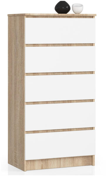 Modern és praktikus 5-fiókos komód, amely tökéletesen ötvözi a Sonoma tölgy és fehér színek eleganciáját. A 16 mm-es laminált lapból készült bútor kiváló tárolási megoldást kínál, miközben stílusos megjelenésével bármely helyiség dísze lehet. Elegáns tárolási megoldás modern otthonokbaEz a kiváló minőségű komód tökéletes választás azoknak, akik praktik