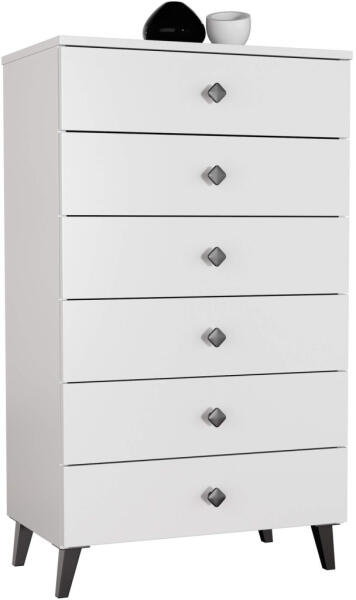Modern, kompakt komód 6 tágas fiókkal, amely tökéletes tárolási megoldást kínál bármely helyiségbe. A fehér-fekete színkombináció és a minőségi laminált anyagok használata elegáns megjelenést biztosít. Elegáns tárolási megoldás modern otthonokbaA Mobi K-06 komód egy sokoldalú bútordarab, amely ötvözi a funkcionalitást és a modern dizájnt. A 16 mm vastag, kivál