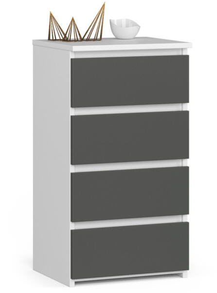Modern, kompakt fiókos szekrény 4 tágas fiókkal, amely tökéletes tárolási megoldást kínál hálószobákba vagy gyerekszobákba. A fehér korpusz és szürke matt frontok elegáns kombinációja minden enteriőrbe harmonikusan illeszkedik. Elegáns tárolási megoldás kompakt méretbenAz AKORD CL4 fiókos szekrény a modern otthonok praktikus bútordarabja. A 40 cm széles, 74 cm magas