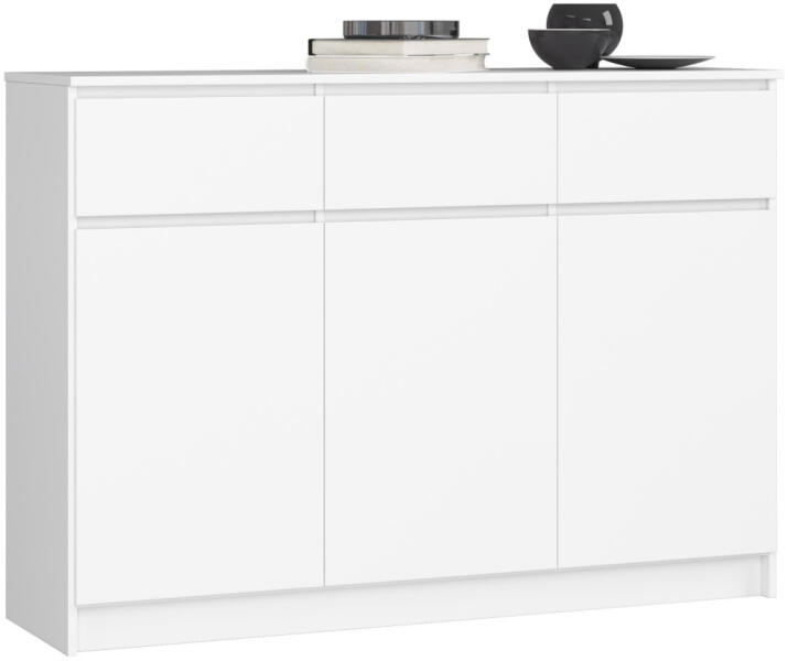 Modern, fehér matt komód 3 ajtóval és 3 fiókkal, amely tökéletes tárolási megoldást kínál. A 16 mm-es laminált lapból készült bútor kiváló minőségű ABS élzárással és görgős fémcsúszókkal rendelkezik. Elegáns és praktikus tárolási megoldás otthonábaEz a modern fehér komód tökéletesen ötvözi az esztétikát és a funkcionalitást. A 138 cm széles, 99 cm ma