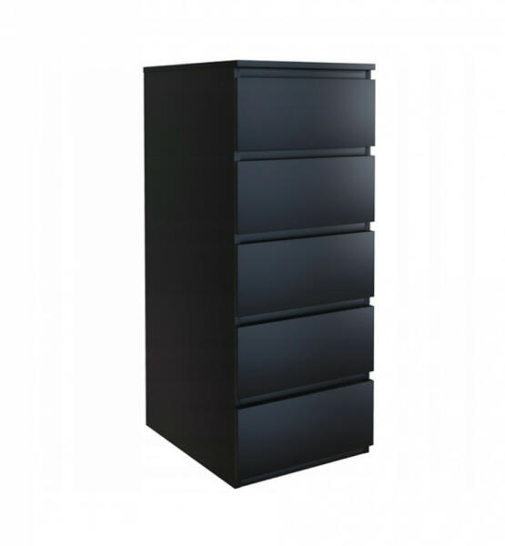 Holzmeister komód fekete színben, a szekrény 5 fogantyú nélküli fiókból áll, amelyek a fém görgős vezetőknek köszönhetően simán és csendesen futnak és csukódnak. Rengeteg helyet biztosít a tárolásra és kiváló eszköz a rendszerezésre is. A modern minimalista stílust tovább erősítik a fogantyú nélküli előlapok. Praktikus bútordarab nappalikba, hálószobákba, gy