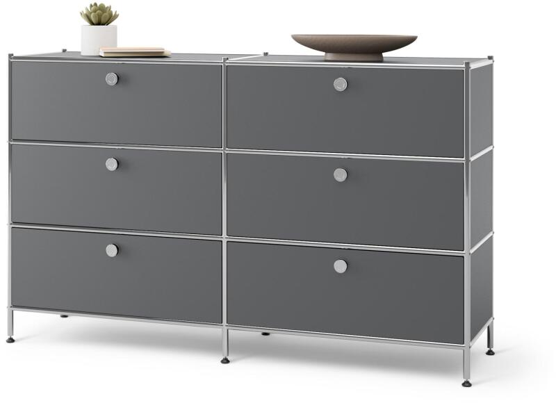 A három lépcsőzetesen egymásra rakott fiók igazán jól mutat, és az eltolt dizájn további tárhelyet kínál. A váznak népszerű kő megjelenése van. A fiókok előlapjainak különféle mintája van. A furnér a régi kőfalakra, mállott fára, rozsdás fémre és vakolatlan betonra emlékeztet, és - az ipari stílus értelmében - a régi gyárépületek varázsát árasztja. Mére