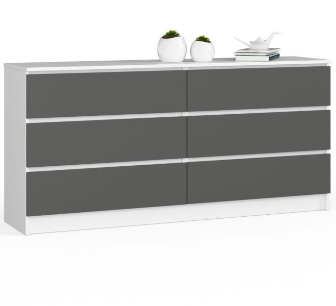 Modern, skandináv stílusú komód hat tágas fiókkal, amely tökéletes tárolási megoldást kínál. A fehér korpusz és szürke matt frontok elegáns kombinációja minden helyiségbe időtlen eleganciát visz. Elegáns tárolás skandináv stílusbanEz a modern vonalvezetésű komód tökéletesen ötvözi a funkcionalitást és az esztétikumot. A 160 cm széles bútor hat tágas fiókkal
