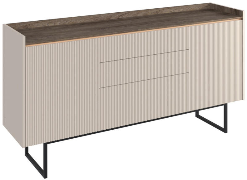 LUCA modern bézs komód magas fekete fém lábakkal. A kétfiókos komód igazán praktikus és elegáns megoldást jelent minden hálószobába vagy gyerekszobába. Minden ajtós szekrény mögött egy-egy polc helyezkedik el. Számos tároló helyet biztosít a ruhaneműknek, kiegészítőknek, fehérneműknek és egyéb apróságoknak. A tetejére is elhelyezheti a dísztárgyait vagy növény