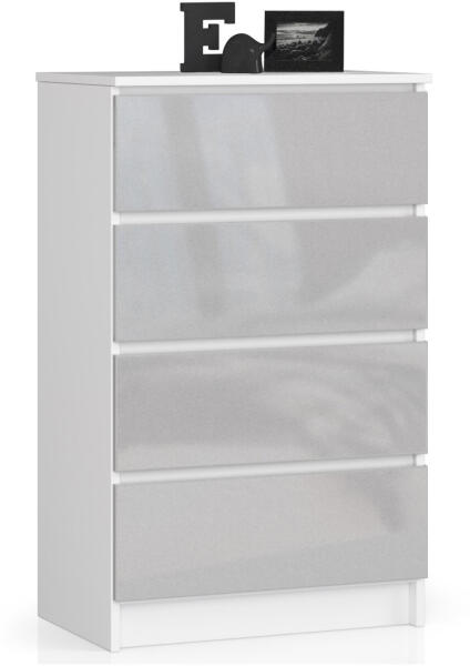 Modern, kompakt komód 4 tágas fiókkal, metál magasfényű MDF frontokkal és fehér korpusszal. Kiváló minőségű ABS élzárással és görgős fémcsúszókkal a tartósság és praktikusság jegyében. Elegáns tárolási megoldás modern otthonokbaEz a stílusos komód tökéletes választás azoknak, akik modern és praktikus tárolási megoldást keresnek. A 60 cm széles bútor négy