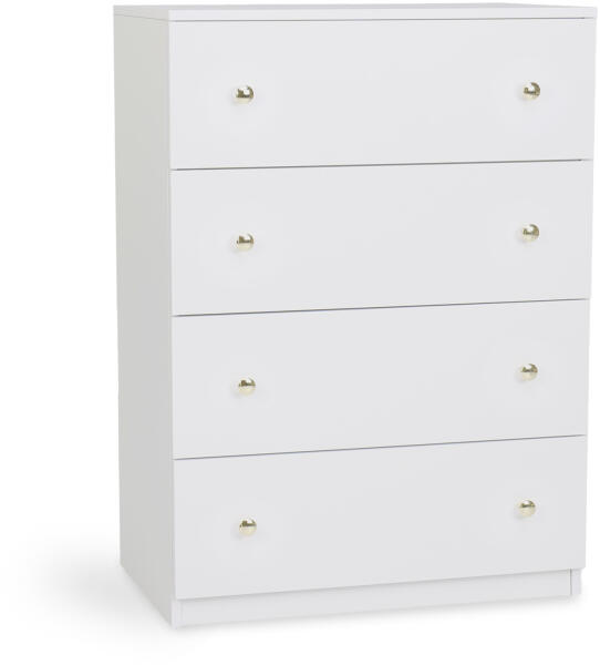 Négyfiókos minőségi és modern fehér LEO L4 komód, amely stílusos arany színű fogantyúkkal kapható. Ugyanolyan jól mutat az otthonában, mint az irodában. Ez a komód letisztult, modern designnal rendelkezik, így mindenki számára ajánljuk, aki praktikus és stílusos tároló helyet keres. A semleges fehér színének hála jól mutat a hálószobában, nappaliban vagy a gyerekszo