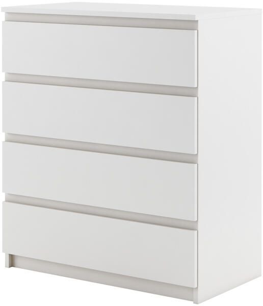 A fehér IDEA komód négy tágas fiókkal rendelkezik, amelyekbe kényelmesen elférnek a zoknik, pólók vagy más ruhanemű. A fiókokon kívül a komód tetejére is elhelyezheti a dísztárgyait, növényeit vagy a családi képeket. A fehér komód minőségi laminált bútorlapból készül. Az élei pedig ABS furnérral biztosítottak. A komód tetejére is elhelyezhet dísztárgyakat vagy