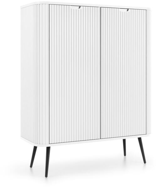 A magas ZOVA K103 komód remek tároló helyet biztosít a nappaliba. A kétajtós komód ajtajai mögött polcok találhatók. 23 cm magas fekete fém lábakon áll, amely modern megjelenítést kölcsönöz a bútornak. Minimalista stílusú komód fehér színben. A ZOVA bútorcsaláddal modern és szofisztikált belső teret hozhat létre. Az egész szett 16 mm vastag laminált bútorlapból k