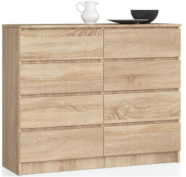 Modern, nyolcfiókos komód Sonoma tölgy kivitelben, amely tökéletes tárolási megoldást kínál. A 16 mm-es kopásálló laminált lapból készült bútor ABS élzárással és praktikus fiókelrendezéssel rendelkezik. Elegáns tárolási megoldás modern otthonokbaA K140 komód egy sokoldalú bútordarab, amely ötvözi a funkcionalitást és az esztétikumot. A nyolc tágas fiók bőség