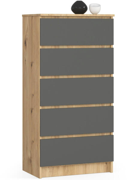Modern és praktikus 5-fiókos komód Artisan tölgy korpusszal és matt szürke frontokkal. Kiváló minőségű laminált bútorlapból készült, ABS élzárással a tartósság érdekében. Elegáns tárolási megoldás modern otthonokbaEz a stílusos komód tökéletes egyensúlyt teremt a funkcionalitás és az esztétika között. Az Artisan tölgy színű korpusz és a matt szürke fiókok