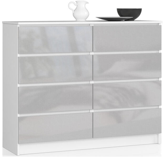 Modern, nyolcfiókos komód metál magasfényű akril frontokkal és matt fehér korpusszal. Tágas tárolóhelyet biztosít 120 cm szélességével és nyolc praktikus fiókjával, tökéletes választás bármely helyiségbe. Elegáns tárolási megoldás modern otthonokbaEz a nyolcfiókos komód tökéletesen ötvözi a funkcionalitást és a modern dizájnt. A 120 cm széles bútor matt fehér